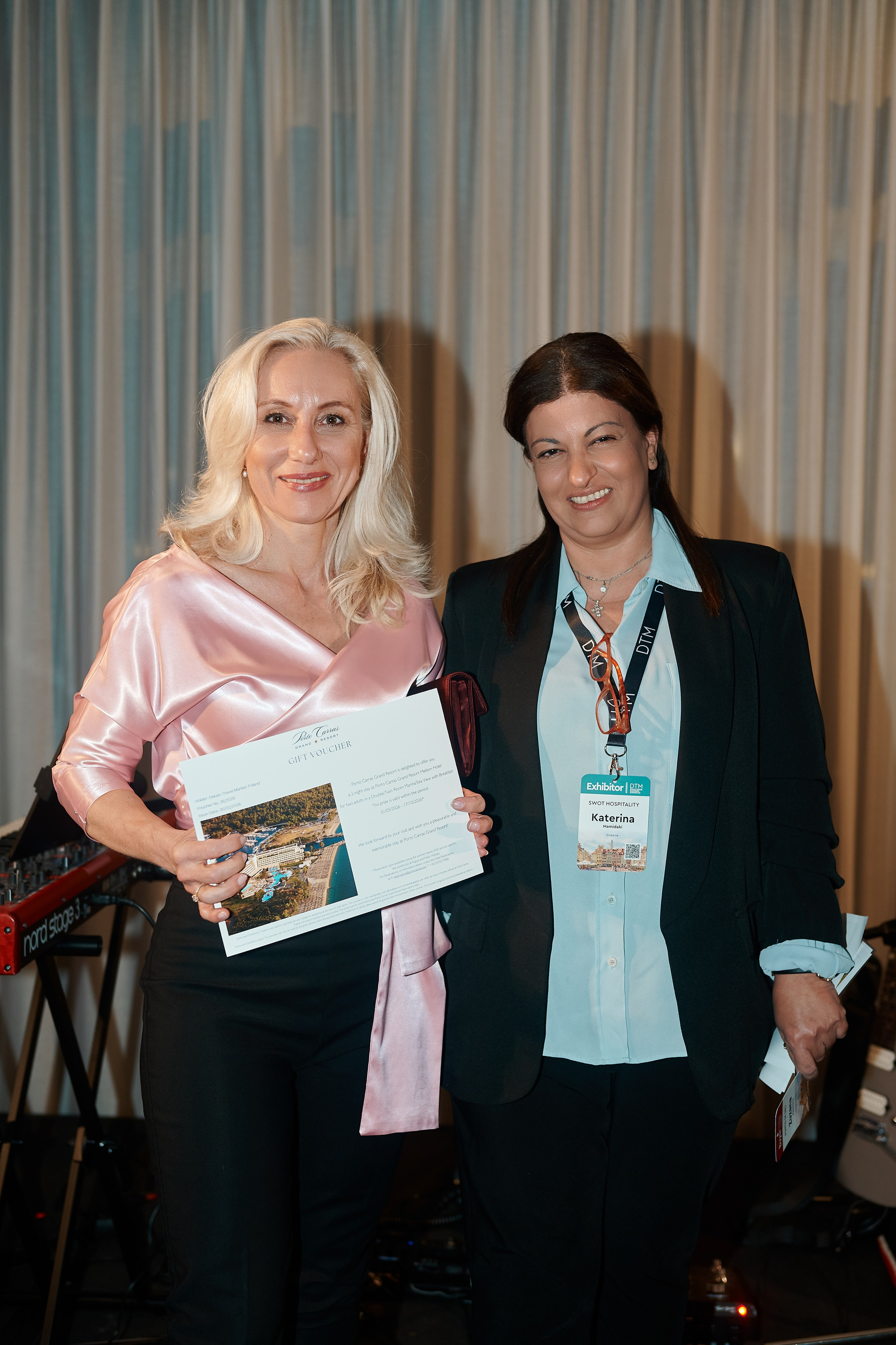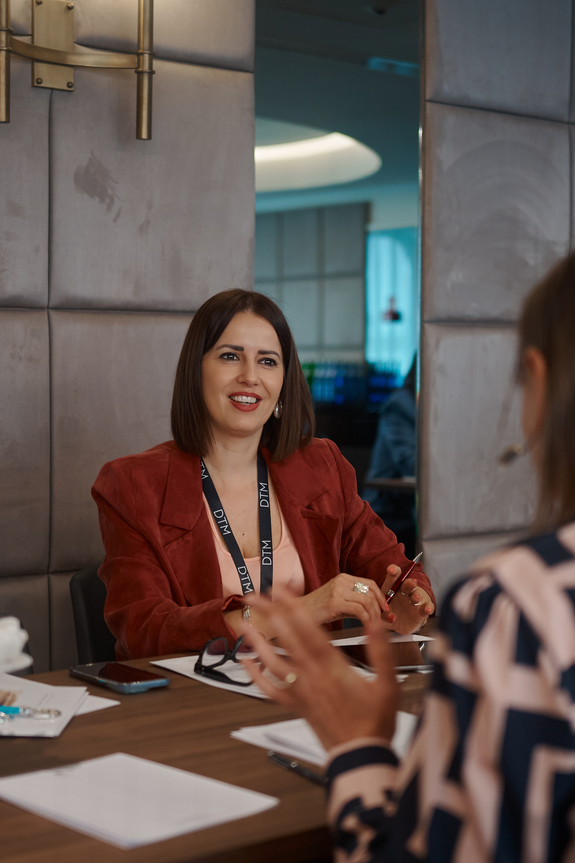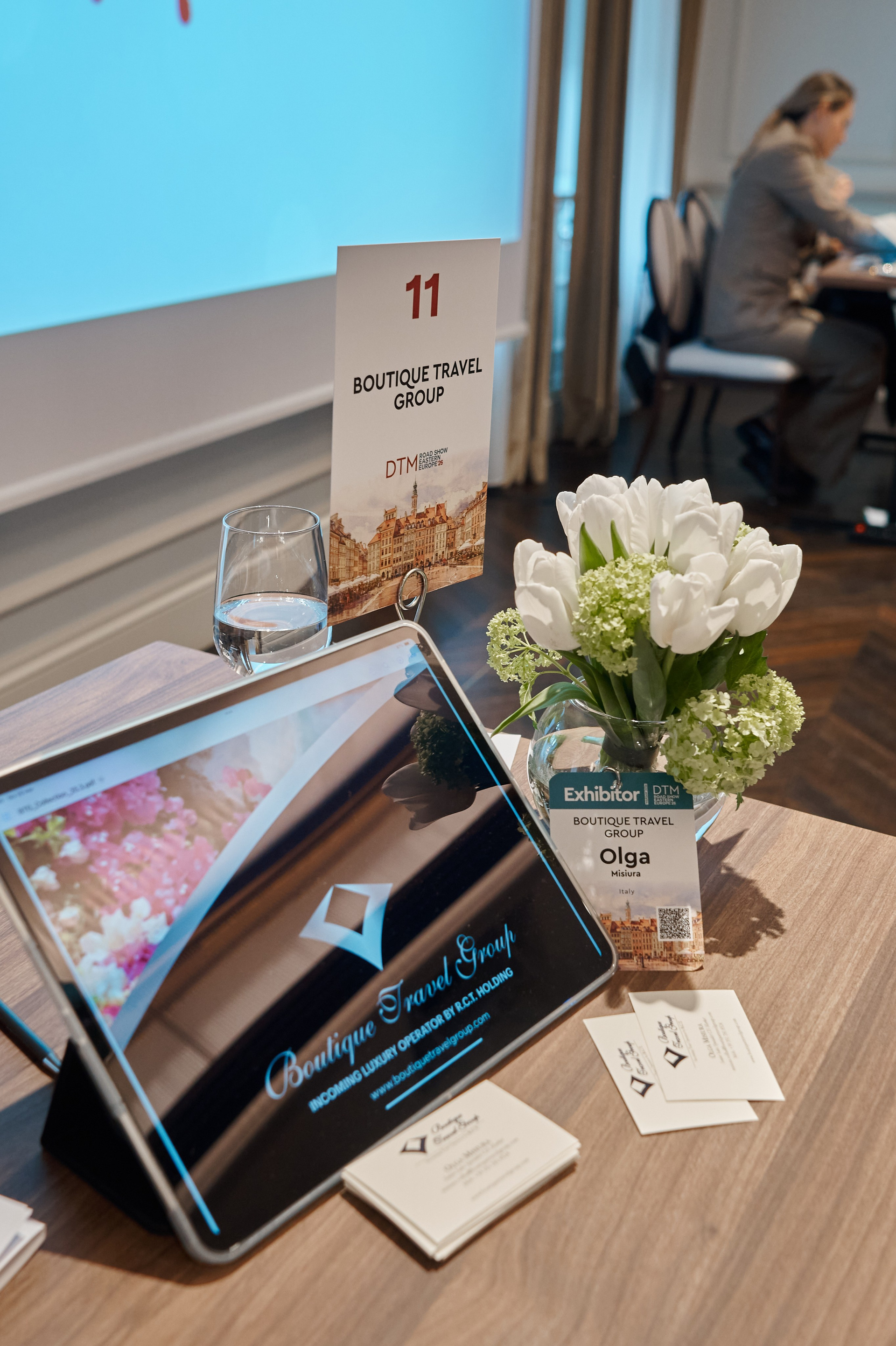 Industry leaders and guests capturing moments on the official DTM Warsaw backdrop. Focus on flawless branding and the personalities who drive the travel industry.